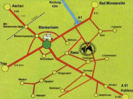 Für Anreise mit einem Navigationsgerät am besten folgende Adresse eingeben: Hardtstraße, 53945 Blankenheim (Ortsteil Reetz). Sobald man sich auf der Hardtstraße befindet, dieser weiter folgen bis zum Ortsausgang. Nach ca. 100 m liegt links oben am Waldrand die Reitanlage.
